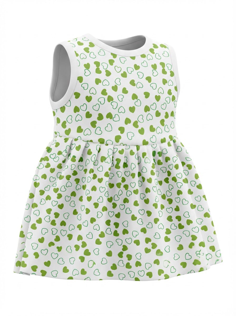 This sleeveless frock features a classic A-line silhouette with a gentle gathered waist that creates a beautiful, full-skirted look. The soft, minty-sage fabric is sprinkled with an adorable all-over heart print, making it an instant favorite for everything from garden parties to casual afternoon strolls.